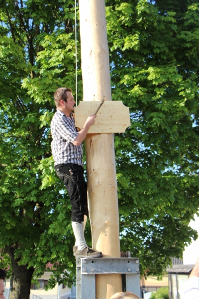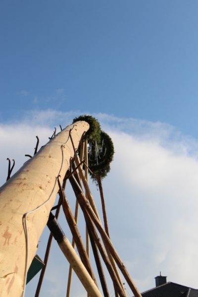 Nach rund 45 Minuten stand der Baum und wurde mit Keilen noch genau ausgerichtet damit dieser schön gerade steht. Der Baumspender montierte in sicherer Höhe das „Maibaumschild“. In den nächsten 31 Mai Tagen schmückt dieser Baum das Ohlsdorfer Ortszentrum.