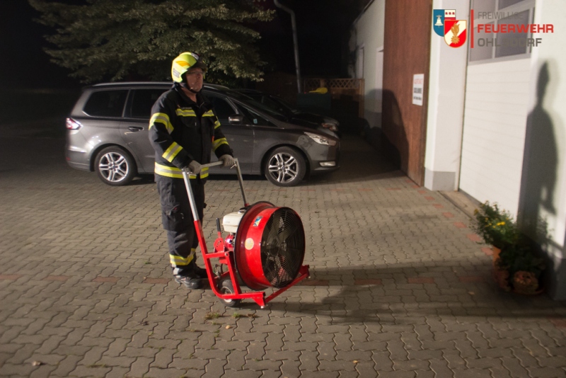 Zwei Atemschutztrupps suchten die vermissten Personen im großen Heu- Strohlager. Dabei wurde bei dieser Übung die Personenrettung in den Vordergrund gestellt. Durch gegenseitige Unterstützung der beiden eingesetzten Atemschutztrupps konnten die vermissten Personen rasch gefunden und ins Freie gebracht werden. Zeitgleich wurde die Beleuchtung aufgebaut und der Hochleistungslüfter in Stellung gebracht.