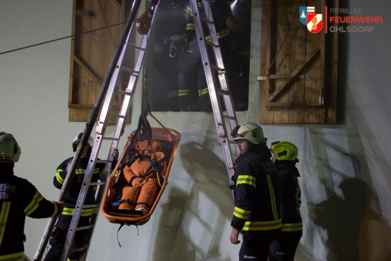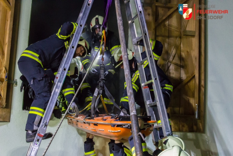 Nach mehrmaliger Nachfrage beim Hausbesitzer stellte sich heraus, dass sich zwei weitere Personen noch im Gebäude befanden. Neuerlich wurden die Atemschutztrupps zur Suche in das Anwesen beordert, ein Sucherfolg stellte sich rasch ein. Annahme war, dass eine der beiden Person schwer am Rücken verletzt war. Daher musste eine schonende, möglichst erschütterungsfreie Rettung durchgeführt werden.