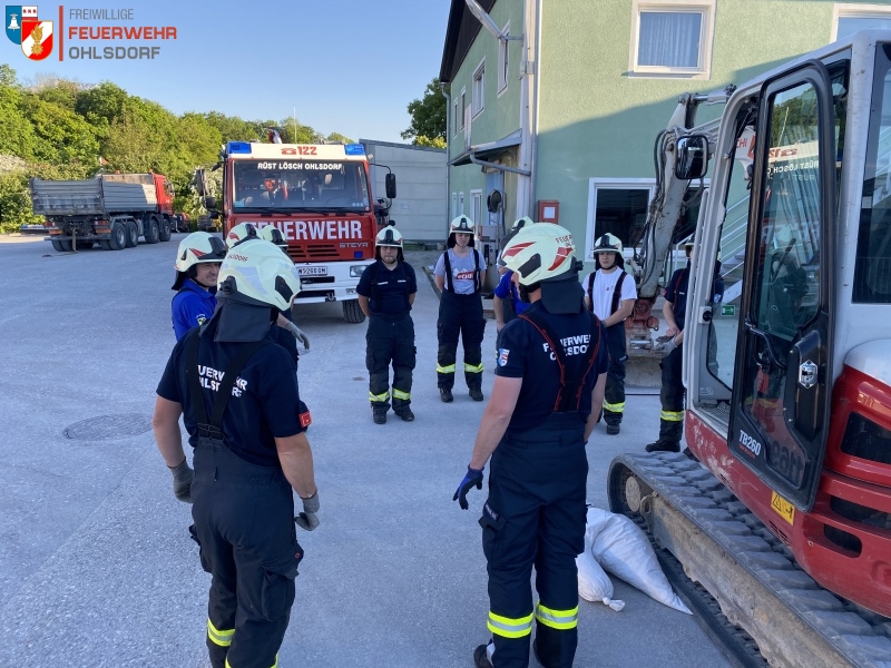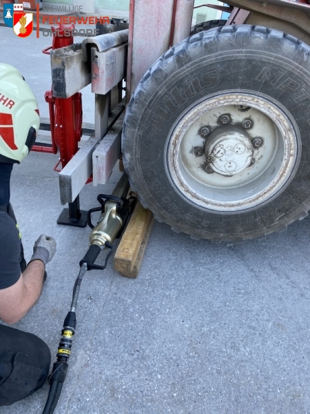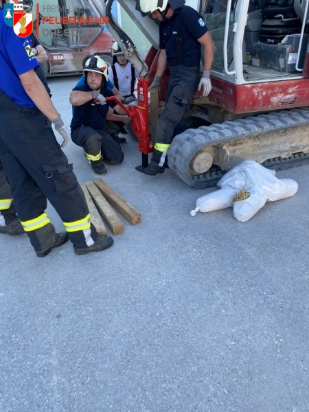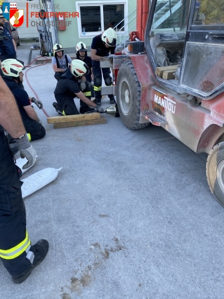 Um die unter dem Bagger eingeklemmte Person retten zu können, wurde das Kettenfahrzeug mittels Hebekissen angehoben und mit Kanthölzern abgesichert. Im zweiten Szenario, jenem mit dem Gabelstapler, wurde von den Kameraden das hydraulische Rettungsgerät, Spreizer, zur Bergung zum Einsatz gebracht.