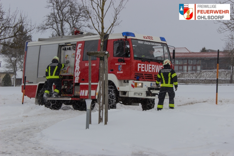 Mit der Seilwinde wurde das Fahrzeug danach aus der Rinne gezogen. Im Anschluss wurde der Parkplatz bzw. der Stellplatz mittels Schaufeln vom Schnee und Eis befreit.