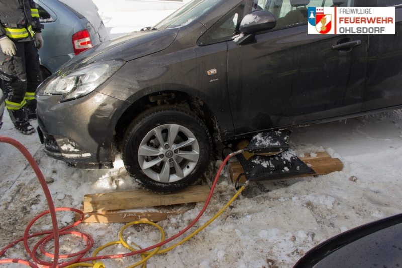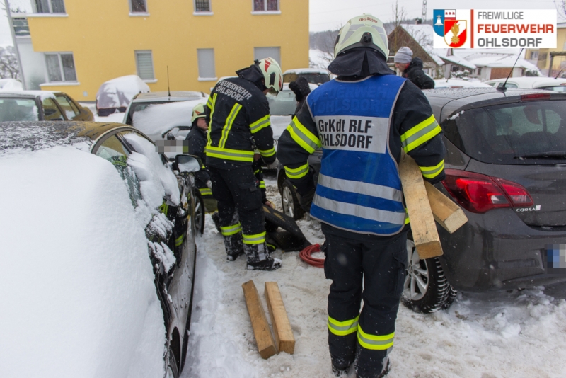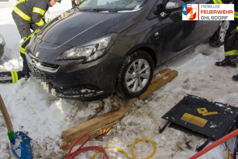 Zahlreiche eigene Versuche des Lenkers und Freunde schlugen fehl, worauf die FF Ohlsdorf zur Hilfeleistung alarmiert wurde. Zuerst wurde das Fahrzeug gegen weiteres Abrutschen gesichert. Danach wurde mit den Hebekissen das Fahrzeug soweit angehoben und die Räder mit Hölzern untergebaut, damit dies wieder auf Höhe des Parkplatzes gelang.