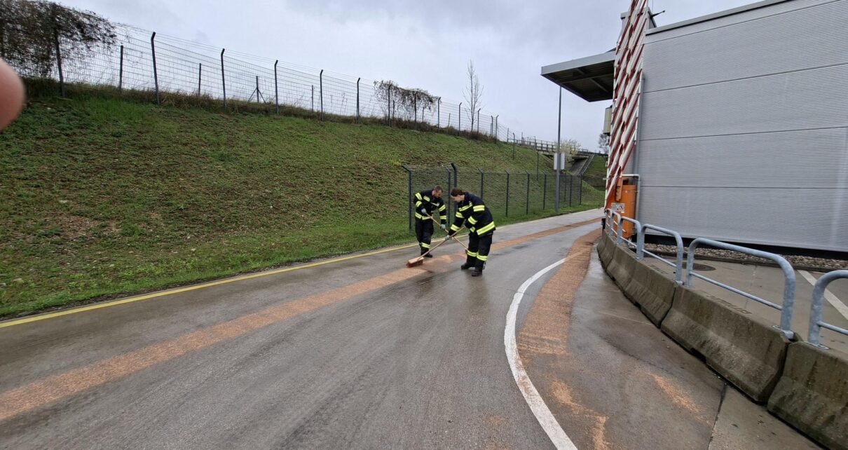 Die verunreinigte Fläche wurde mit Ölbindemittel abgestreut, eine werkseigene Kehrmaschine zum Einsatz hinzugezogen.